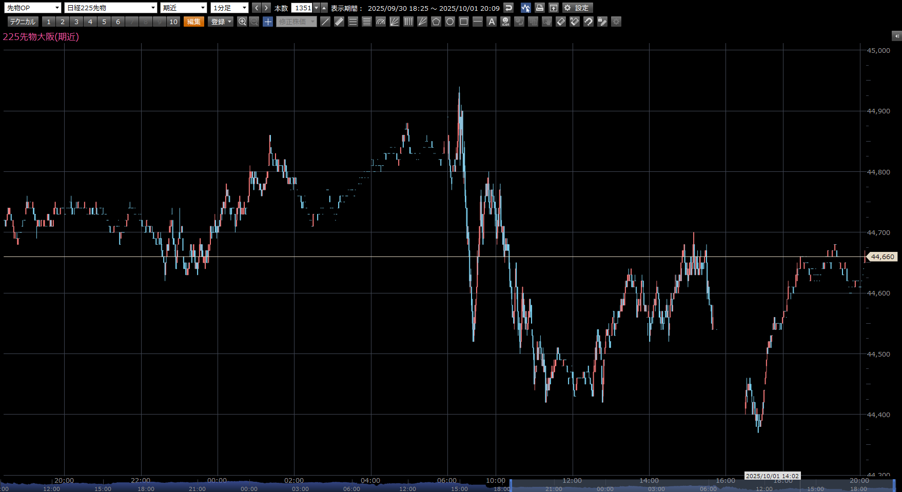 本日の日経先物の注目ポイントは、上 44940円。 下 44740円。