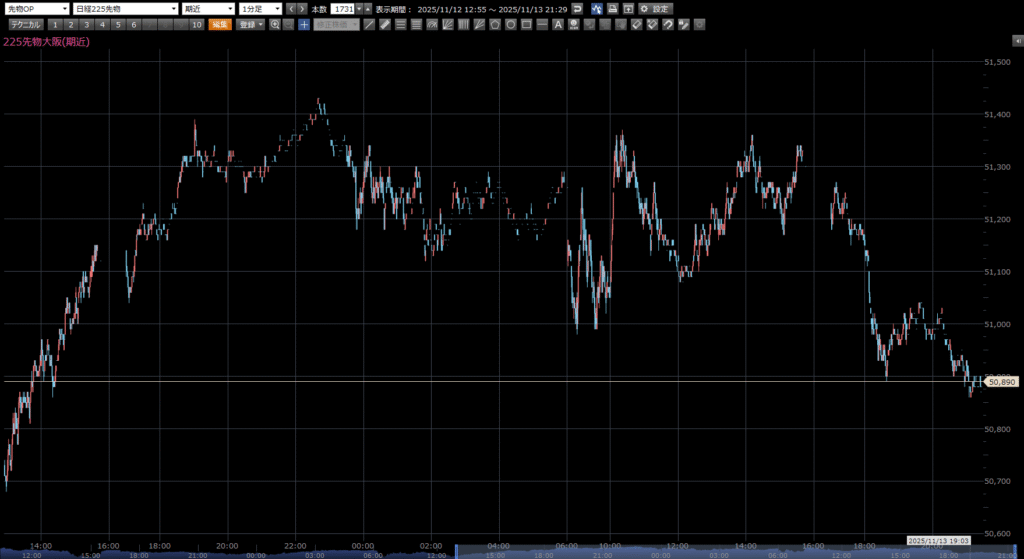 本日の日経先物の注目ポイントは、上 51550円。下 50780円。