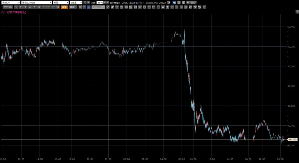朝一コメント:フェニックス 日経225先物トレード倶楽部 X Facebook LINE コピー 2025.12.01 本日の日経先物の注目ポイントは、上 50380円。下 50010円。 ナイトは60分足のリズムライン通り、深夜1時より上昇。この勢いで50380円を抜くかに注目です!抜けば50610円から50630円の上値抵抗帯を試します。 50620円を抜けば4時間足ベースのトレンド転換を意味します。 50010円から49960円が下値抵抗帯です。