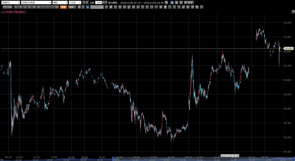本日の日経先物の注目ポイントは、上 50610円。下 50170円。