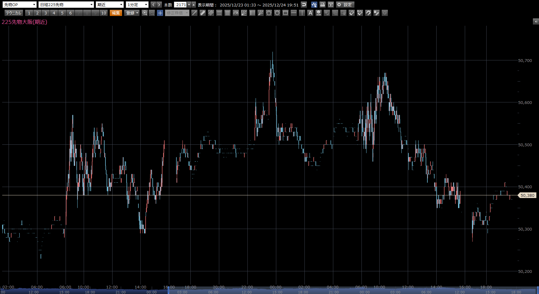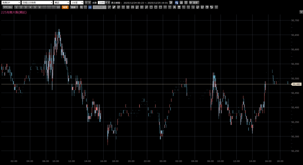 本日の注目ポイントは、上 50580円。下 50200円。