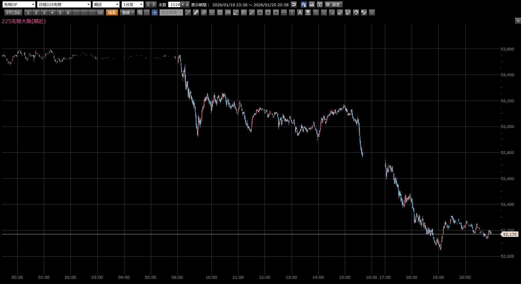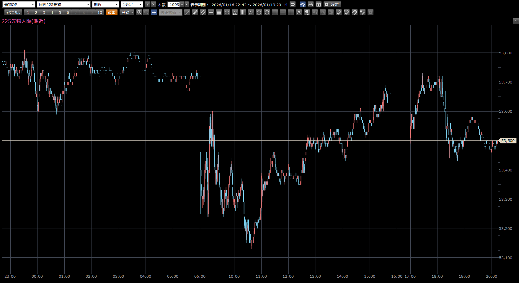 朝一コメント:フェニックス 日経225先物トレード倶楽部 X Facebook LINE コピー 2026.01.19 本日の注目ポイントは、上 53800円。下 53350円。 ・4時間足の75MAをまずは意識していきましょう!・青ラインの下げ波を抜くまで赤4の調整が続きます。・4時間足で示している紫ラインの下値抵抗線に注目していきましょう!