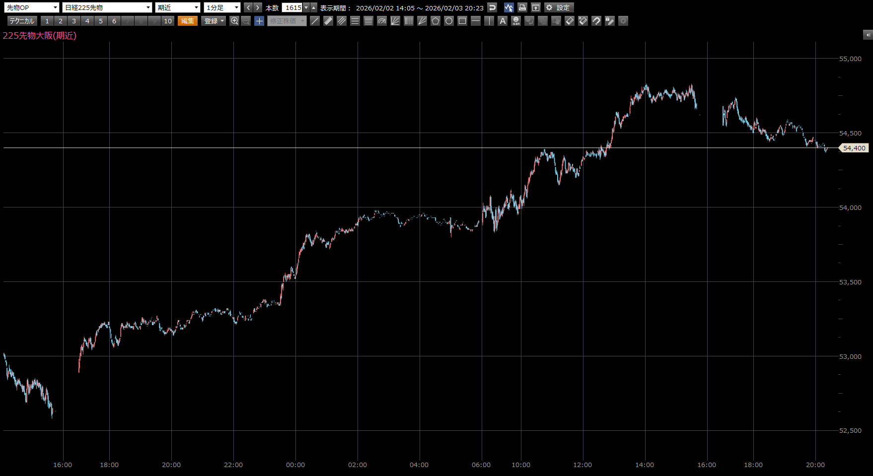 本日の注目ポイントは、上 54520円。 下 53530円。