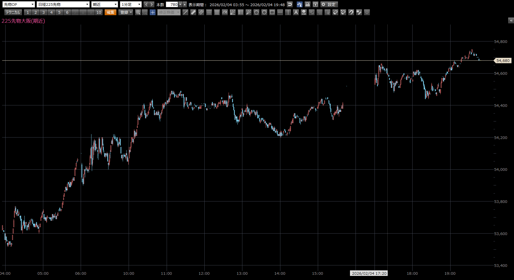 本日の注目ポイントは、上 54930円。 下 54170円。