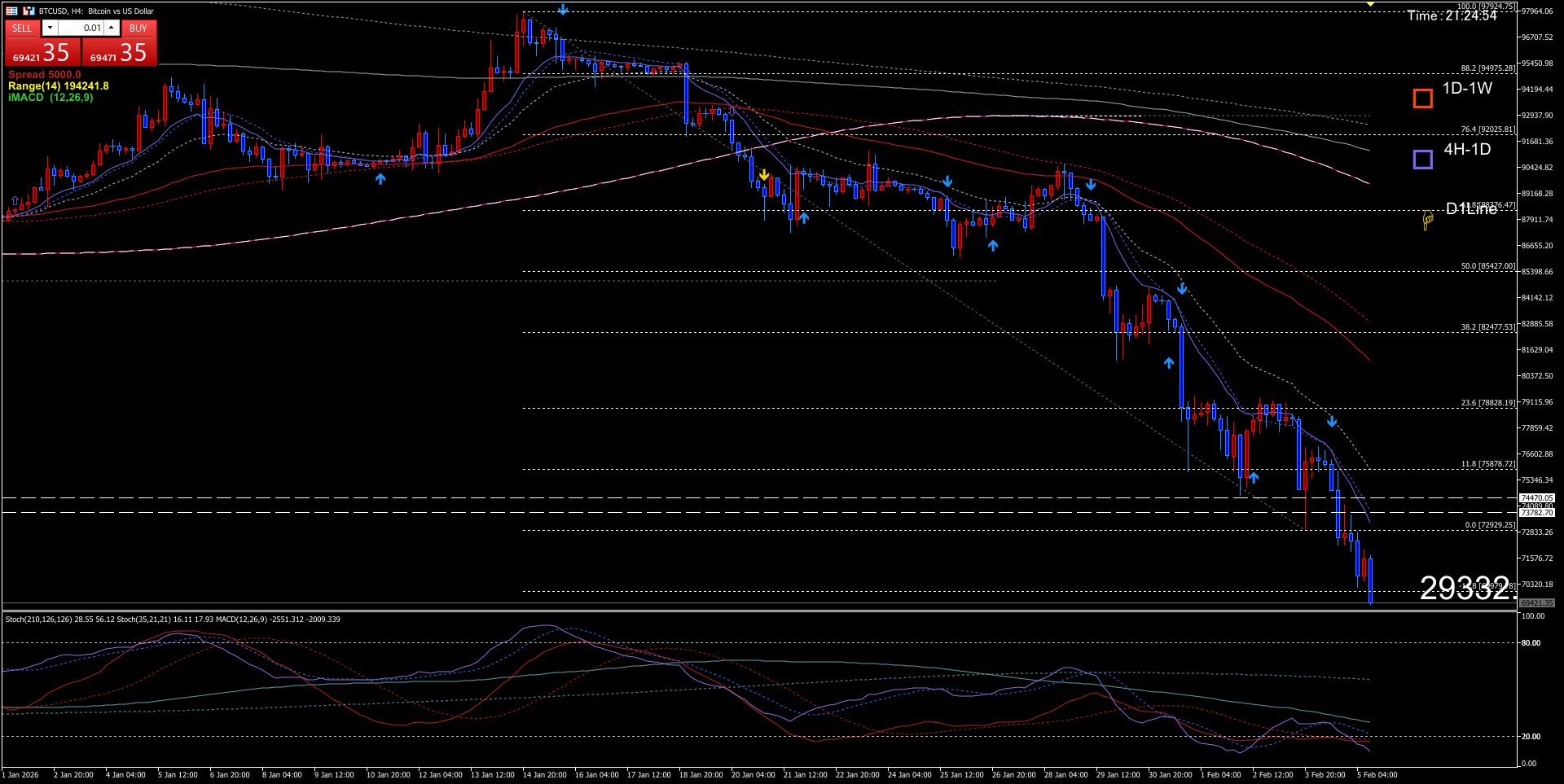 ・4時間足の青ラインの下げ波は60分足の下げ波と重なります。