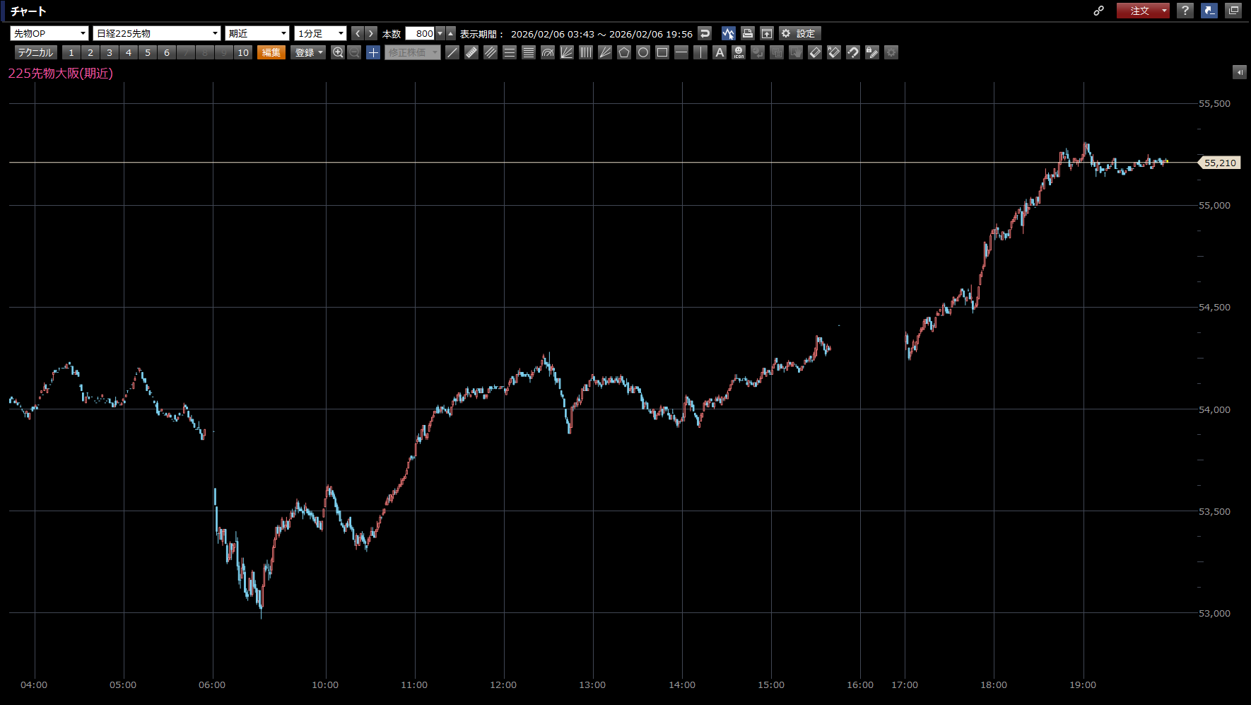 日経先物はナイトで55120円(黄3)まで上昇。
