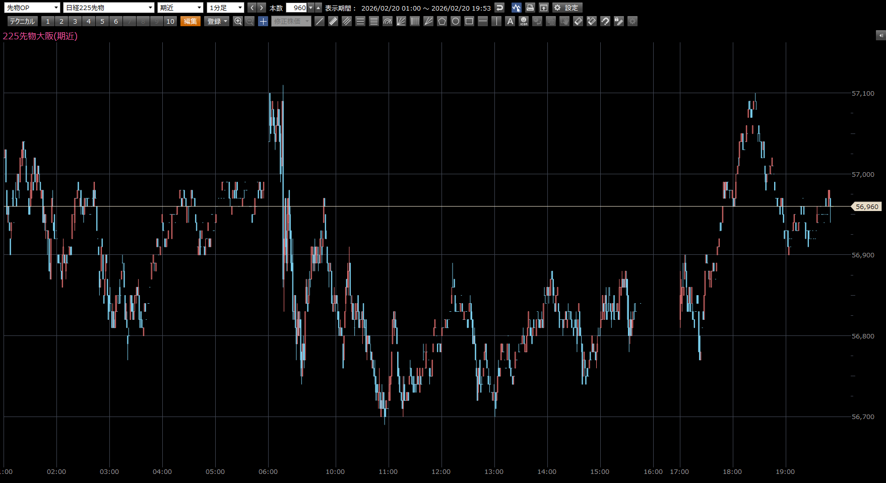 本日の注目ポイントは、上 57330円。下 56700円。