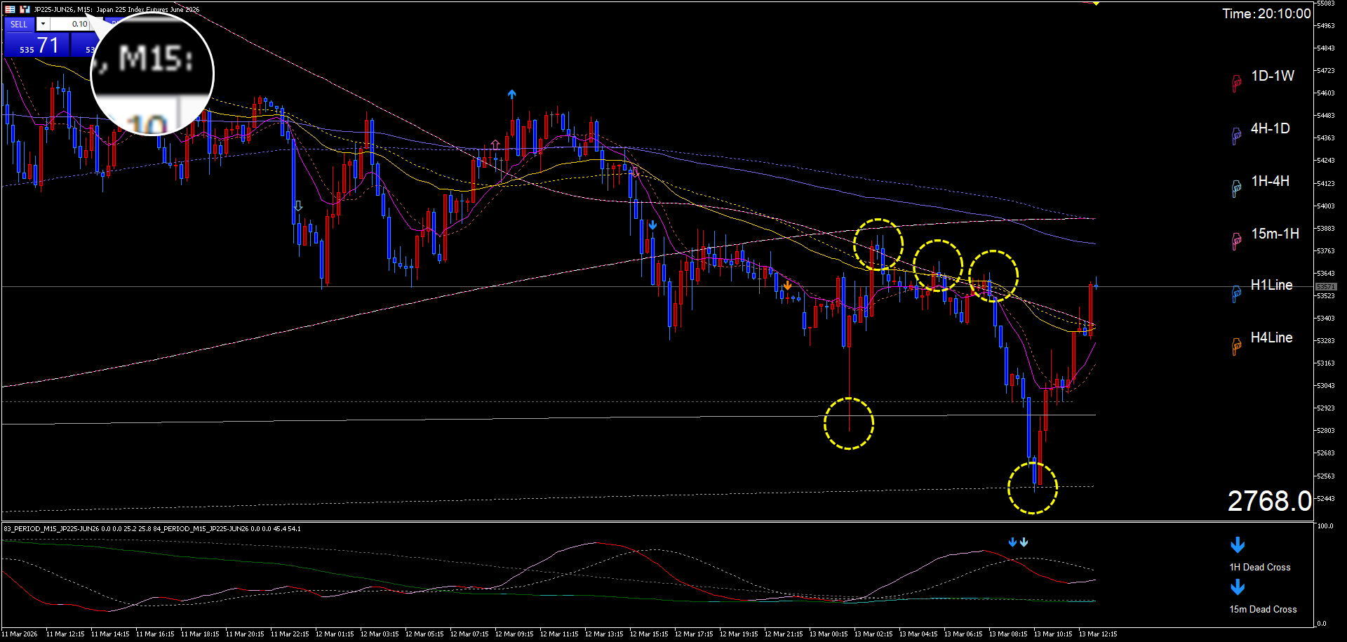 4時間足の13MAと25MA、60分足の下げ波に注目です。