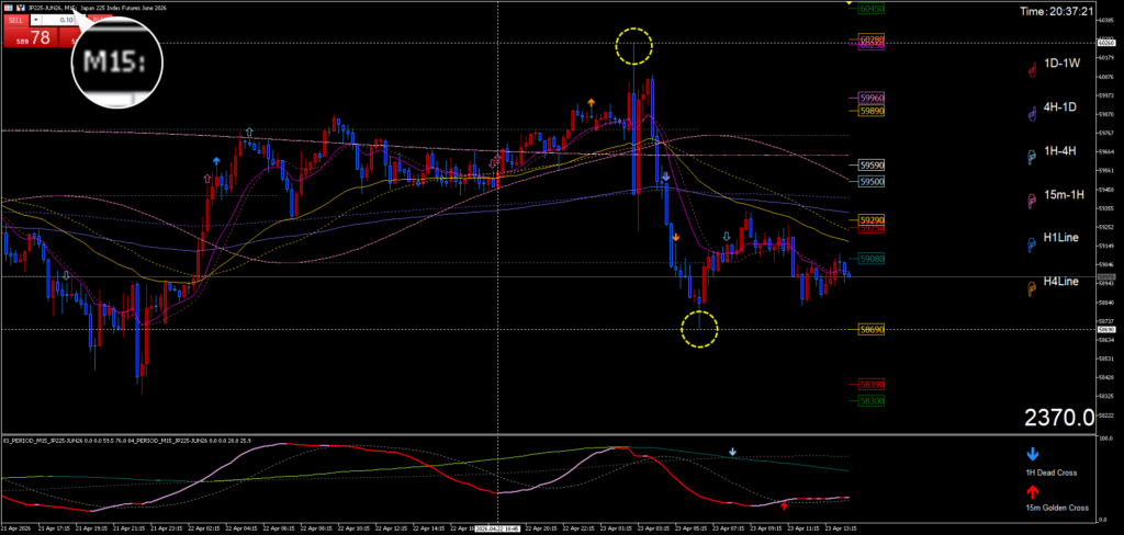 本日の日経先物の注目ポイントは、上 59930円。下 59550円。